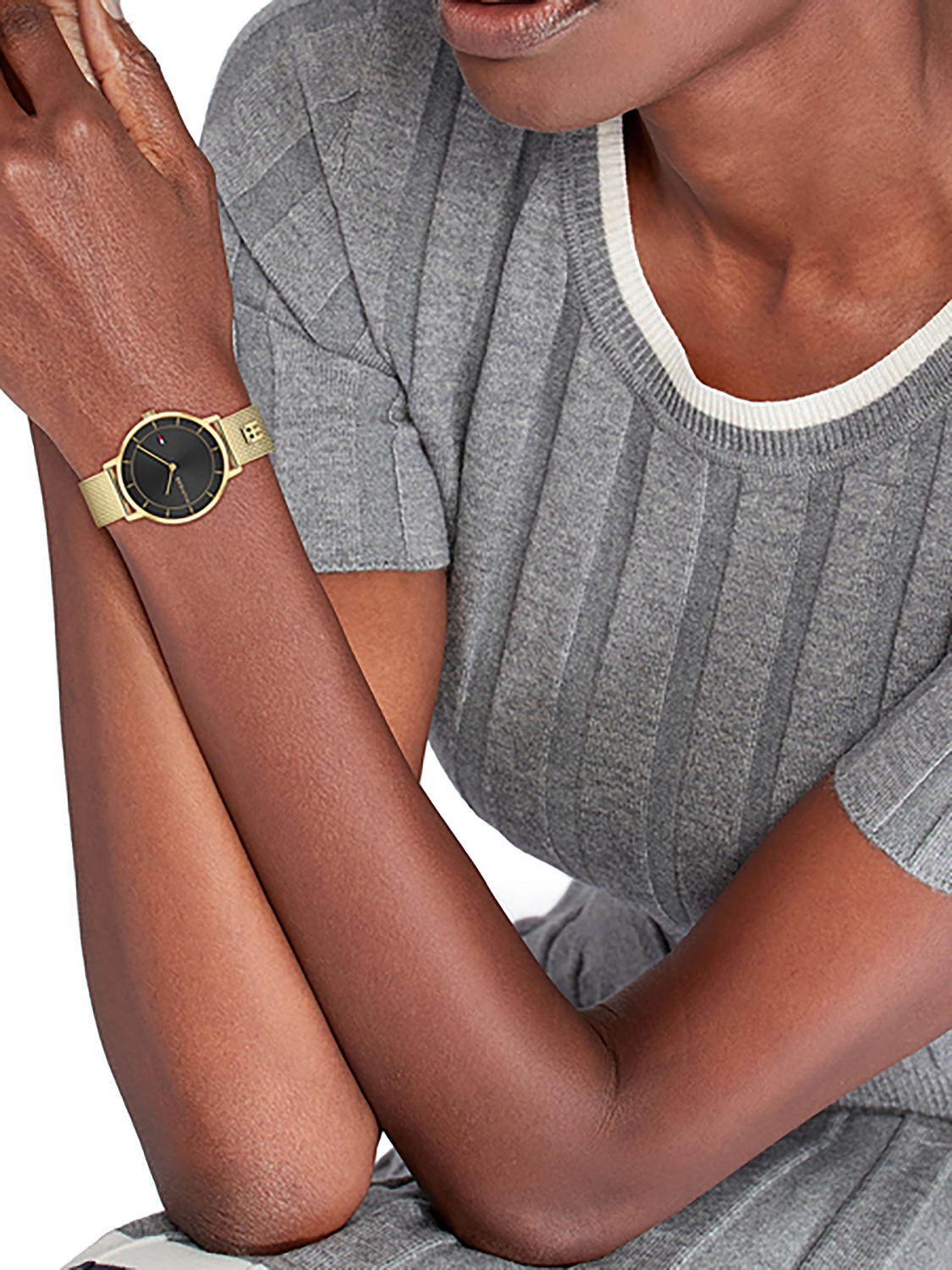 Женские кварцевые часы на стальном браслете миланского плетения. Часы с круглым корпусом. Минеральное стекло. Циферблат с метками в виде штрихов. Рифленая заводная головка.