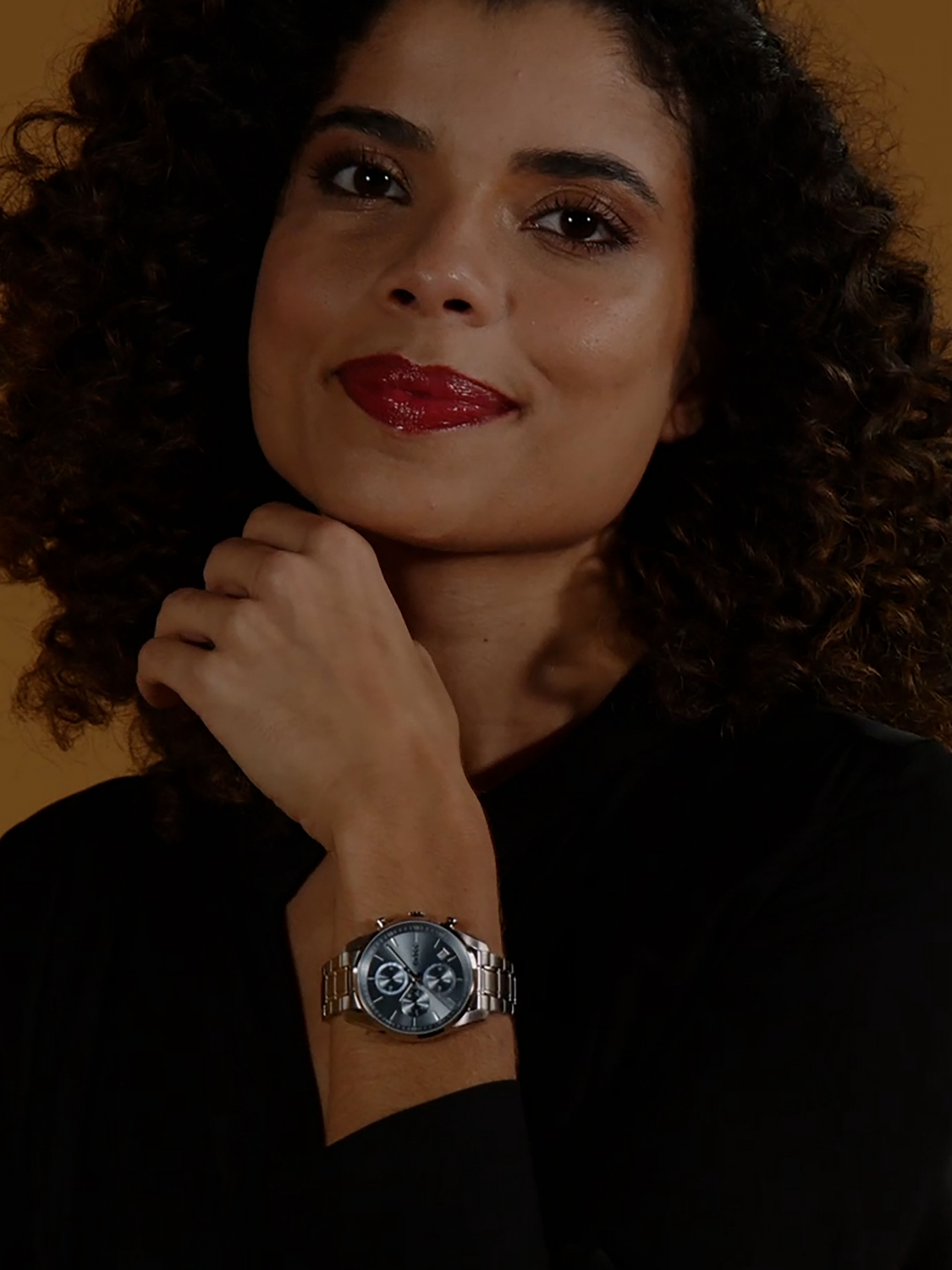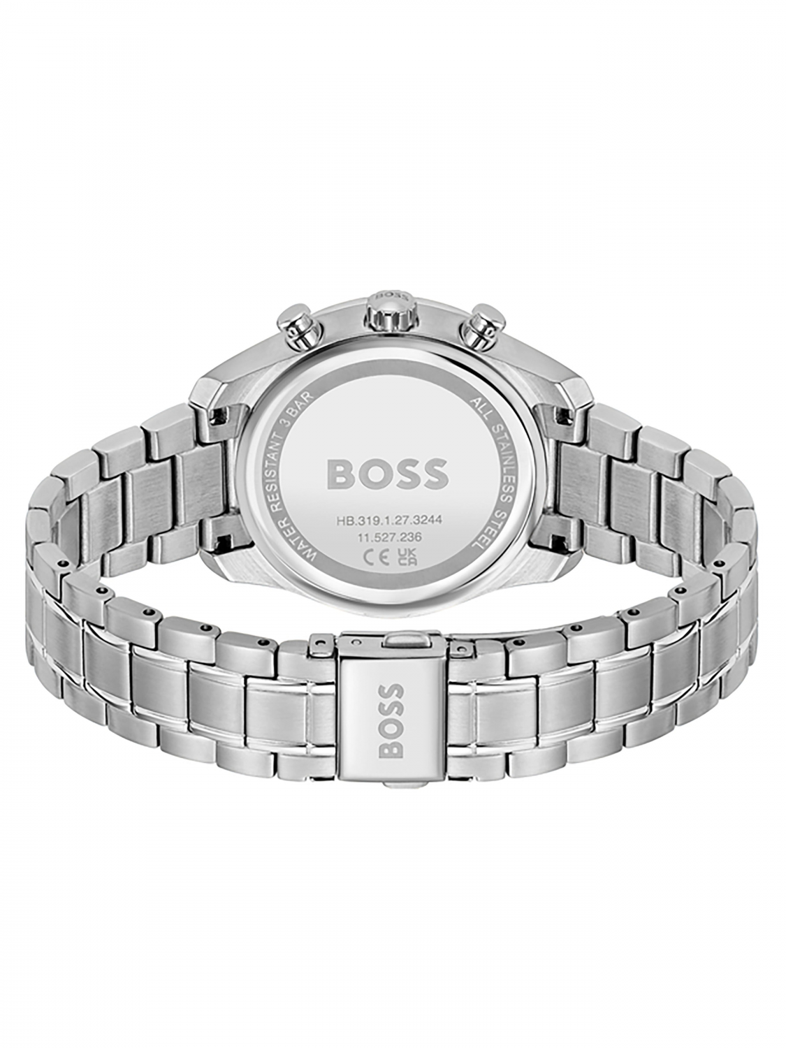 Эта модель хронографа имеет светло-голубой циферблат и апертуру даты между 4 и 5 часами. На циферблате расположены серебристые часовые индексы. Корпус из нержавеющей стали. Диаметр корпуса составляет 38 мм.Браслет выполнен из нержавеющей стали, который застегивается на раскладывающуюся застежку. Водозащита от случайных брызг и капель дождя.