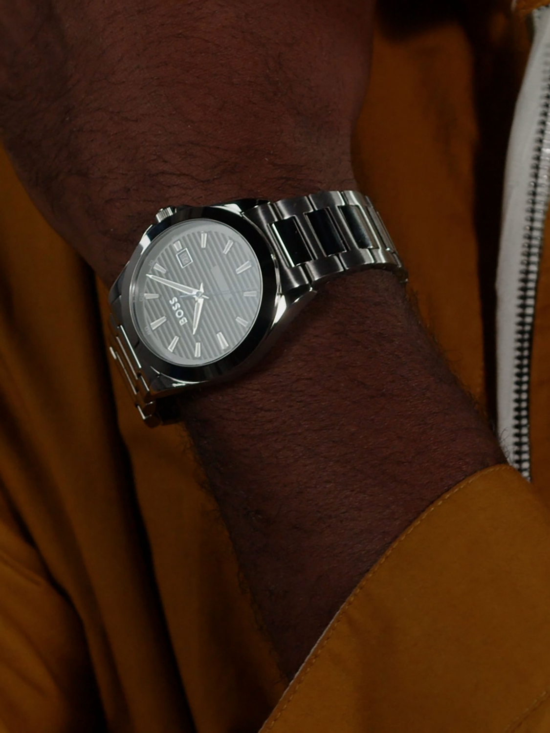 Мужские кварцевые часы BOSS 1514170, коллекция STRIKE. Корпус часов и браслет выполнены из нержавеющей стали. Диаметр: 41 мм. Водозащита 5 bar.
