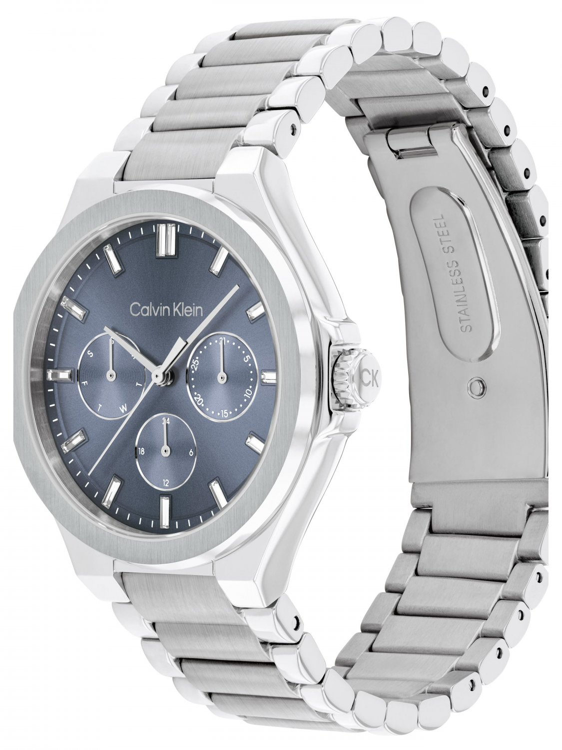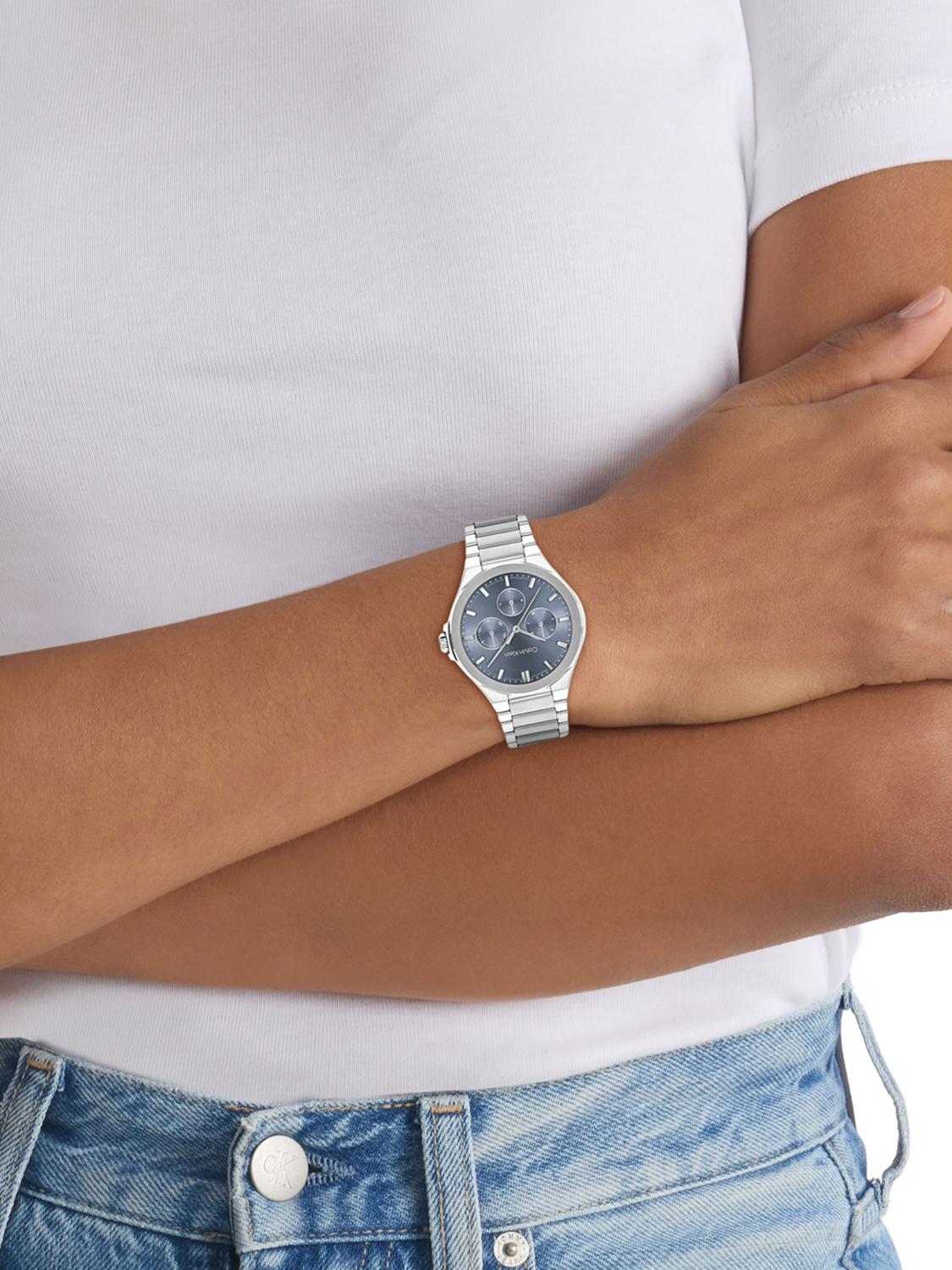 Эта модель имеет синий циферблат с тремя дополнительными циферблатами. Циферблат также имеет серебристые индексы и серебристые стрелки. Корпус из нержавеющей стали обрамляет циферблат.