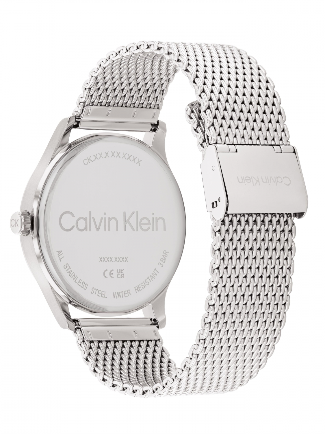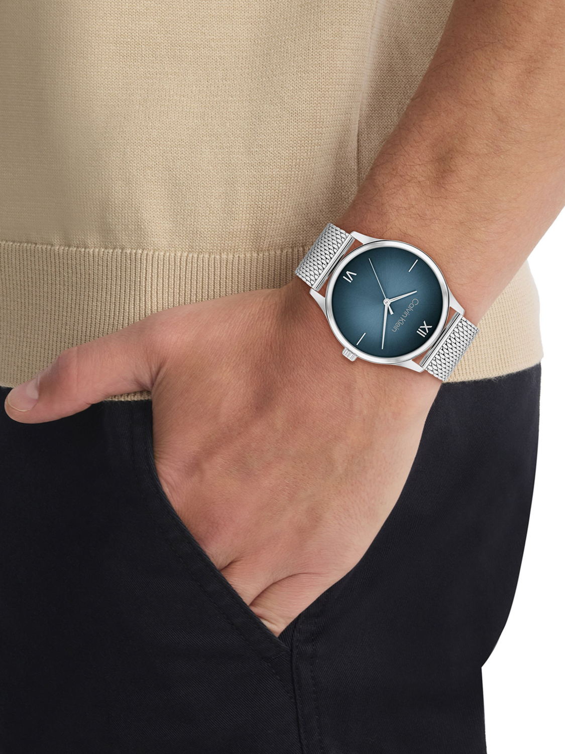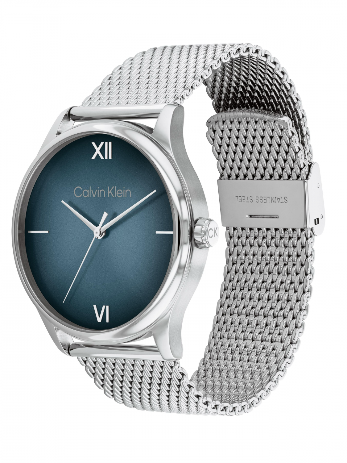 Циферблат синего цвета украшен фирменным логотипом Calvin Klein и защищен минеральным стеклом.