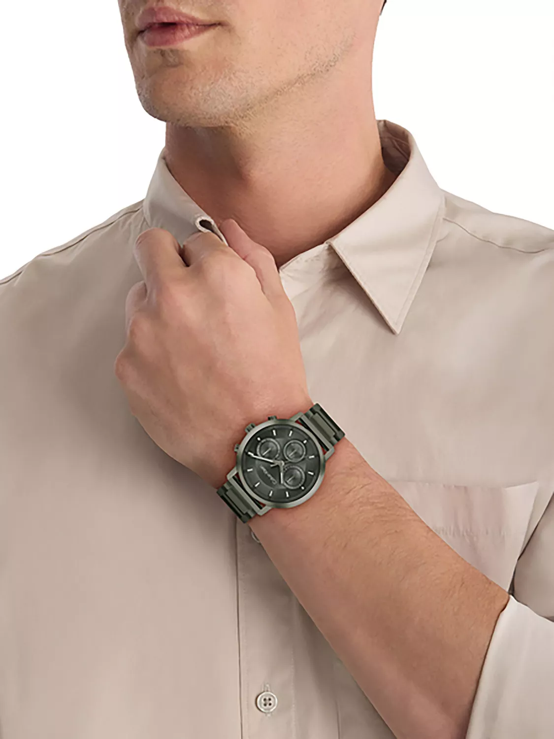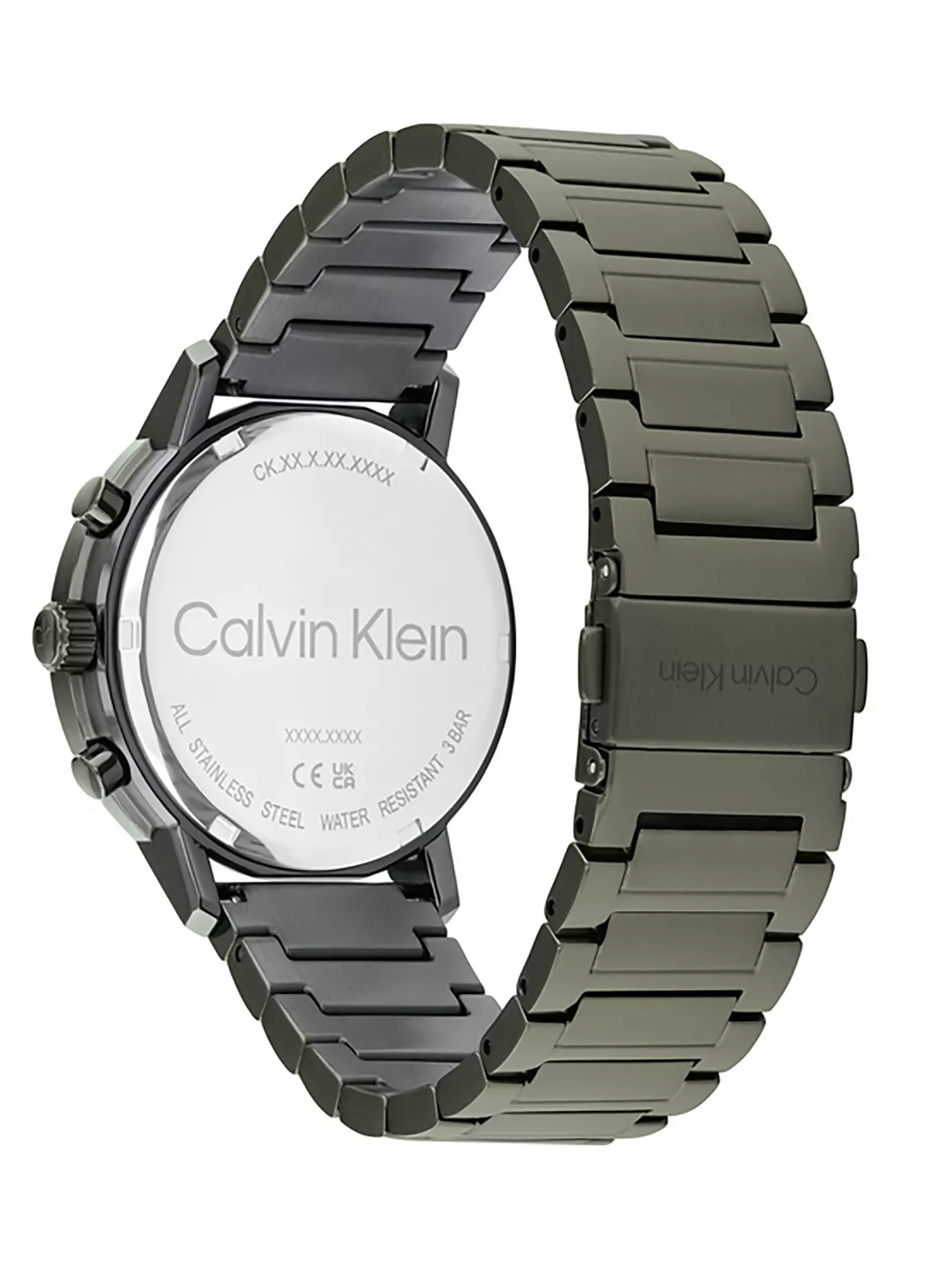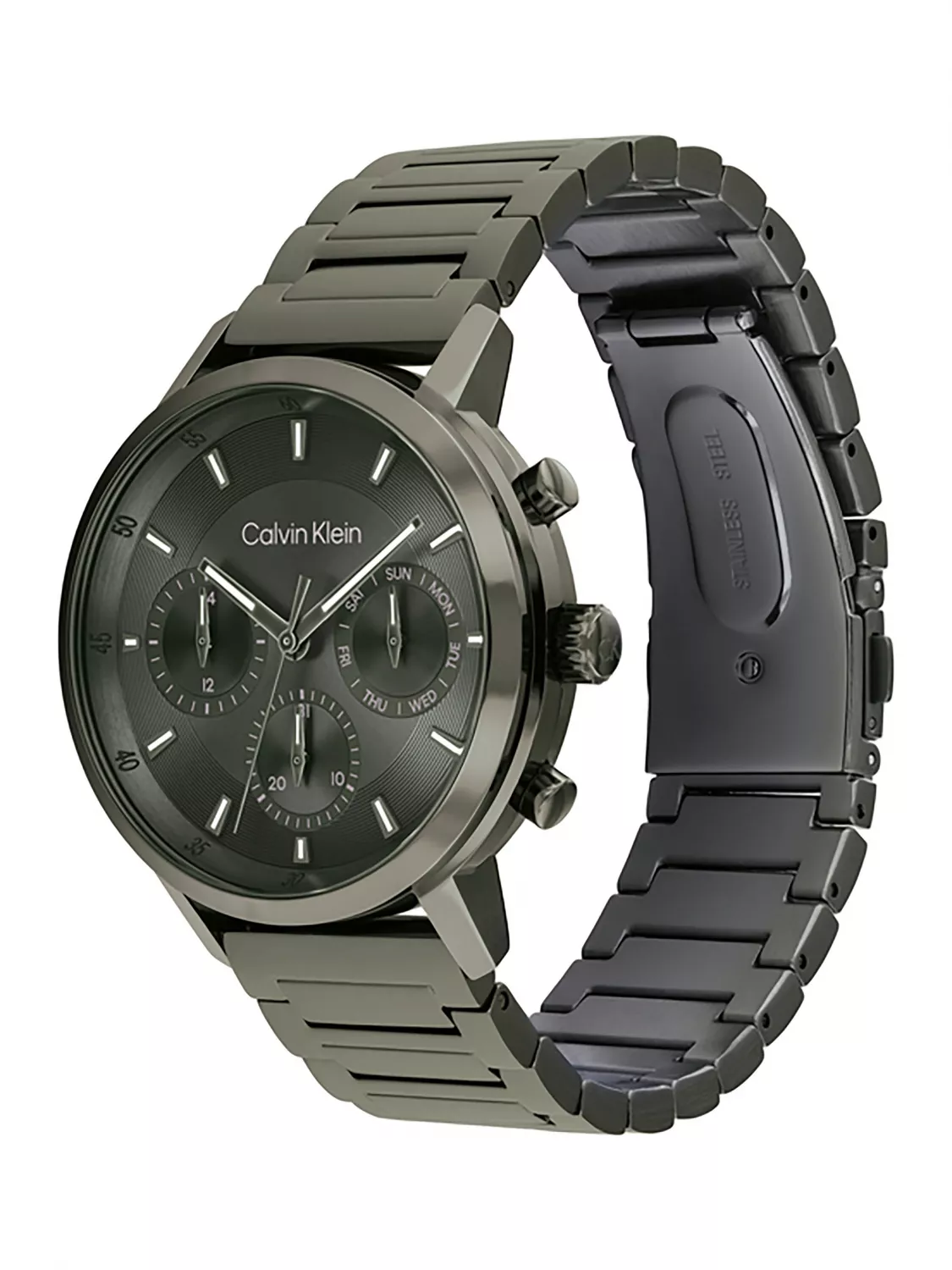 Calvin Klein 25200494 — это мужские многофункциональные часы из коллекции Gauge, выполненные в современном монохромном дизайне с темно-зеленым оформлением. Круглый корпус и браслет с зеленым ионным напылением (IP). Тёмно-зеленый матовый циферблат защищён минеральным стеклом. Кварцевый многофункциональный механизм отображает время, день недели, дату и 24-часовой формат на отдельных дополнительных циферблатах. Корпус и браслет изготовлены из нержавеющей стали. Диаметр корпуса составляет 42 мм.. Браслет с раскладывающейся застежкой с кнопками (клипса). Водонепроницаемость 3 АТМ, что обеспечивает защиту от брызг и дождя,но не подходит для плавания.