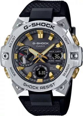 Харизматичный лимитированный релиз конца 2024 года из серии G-STEEL в стальном корпусе с черным циферблатом и деталями цвета золота. Модель посвящена 2025 году — году Змеи по восточному календарю, именно поэтому текстура змеиной чешуи присутствует на циферблате и кнопках часов. Новый переосмысленный брутальный рубленный корпус GST-B400 из стали и полимера обладает толщиной всего 12.9 мм, что на момент выхода данной линейки является абсолютным рекордом для стальных джишоков. В часах используется технология Carbon Core Guard: модуль часов защищает от любых механических повреждений сверхпрочная и легкая карбоновая капсула. На борту модель на стальном браслете имеет: солнечную батарею, технологию Bluetooth для синхронизации с вашим смартфоном, автоматическую двойную подсветку дисплеев и циферблата, водозащиту в 200 метров и еще более десятка функций. Напомним, в коллекции G-STEEL модели приближаются к классическому образу наручных часов, при этом сохранив уникальную джишоковую начинку, что делает эти часы несравнимо прочнее и функциональнее, чем их механические собратья. Сегодня стальная серия G-SHOCK состоит из 4 активных линеек с Bluetooth: харизматичные аналоговые модели GST-B100 с турбиной на циферблате и секундной стрелкой и аналого-цифровые модели без секундных стрелок: GST-B500 и GST-B400, а также еще более компактные и полностью аналоговые GST-B600.