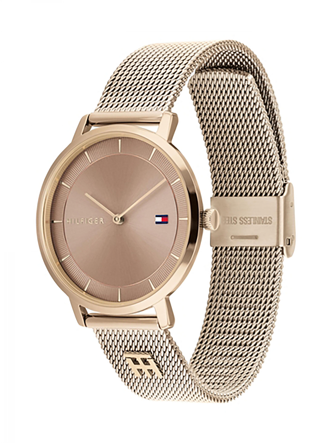 Женские кварцевые часы на стальном браслете миланского плетения. Часы с круглым корпусом. Минеральное стекло. Циферблат с метками в виде штрихов. Рифленая заводная головка.
