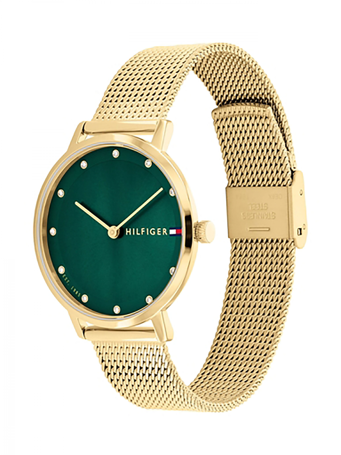 Женские кварцевые часы на стальном браслете миланского плетения. Часы с круглым корпусом. Минеральное стекло. Циферблат с метками в виде точек с кристаллами. Рифленая заводная головка.