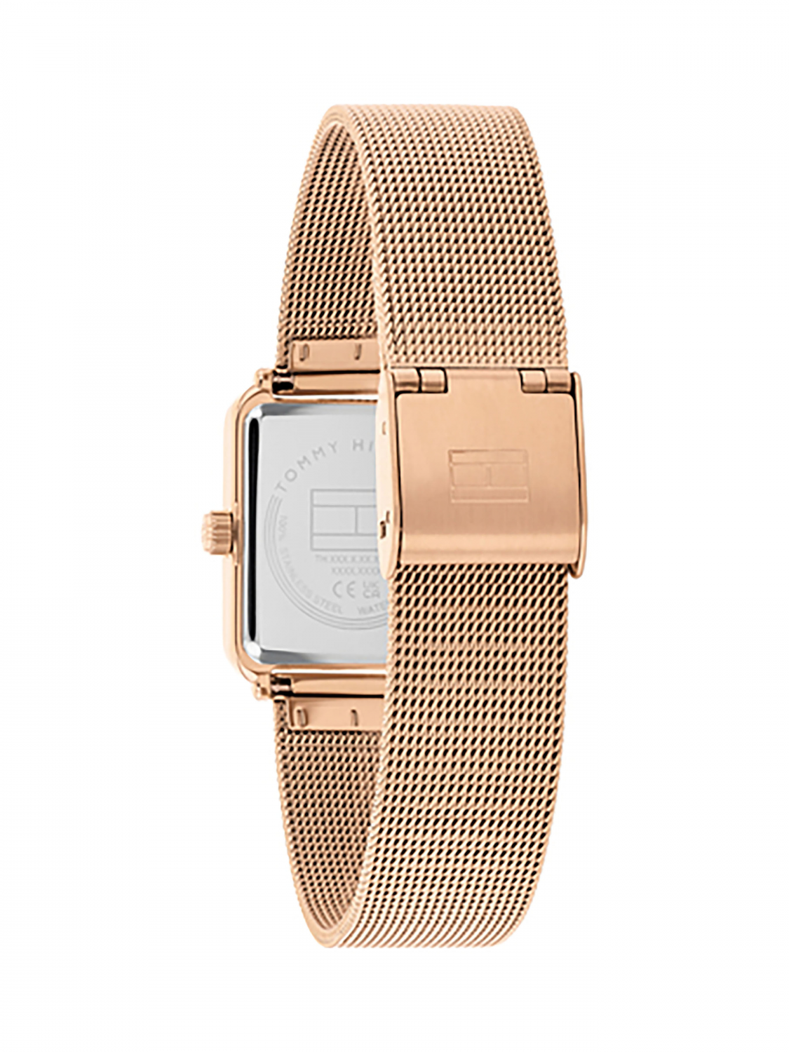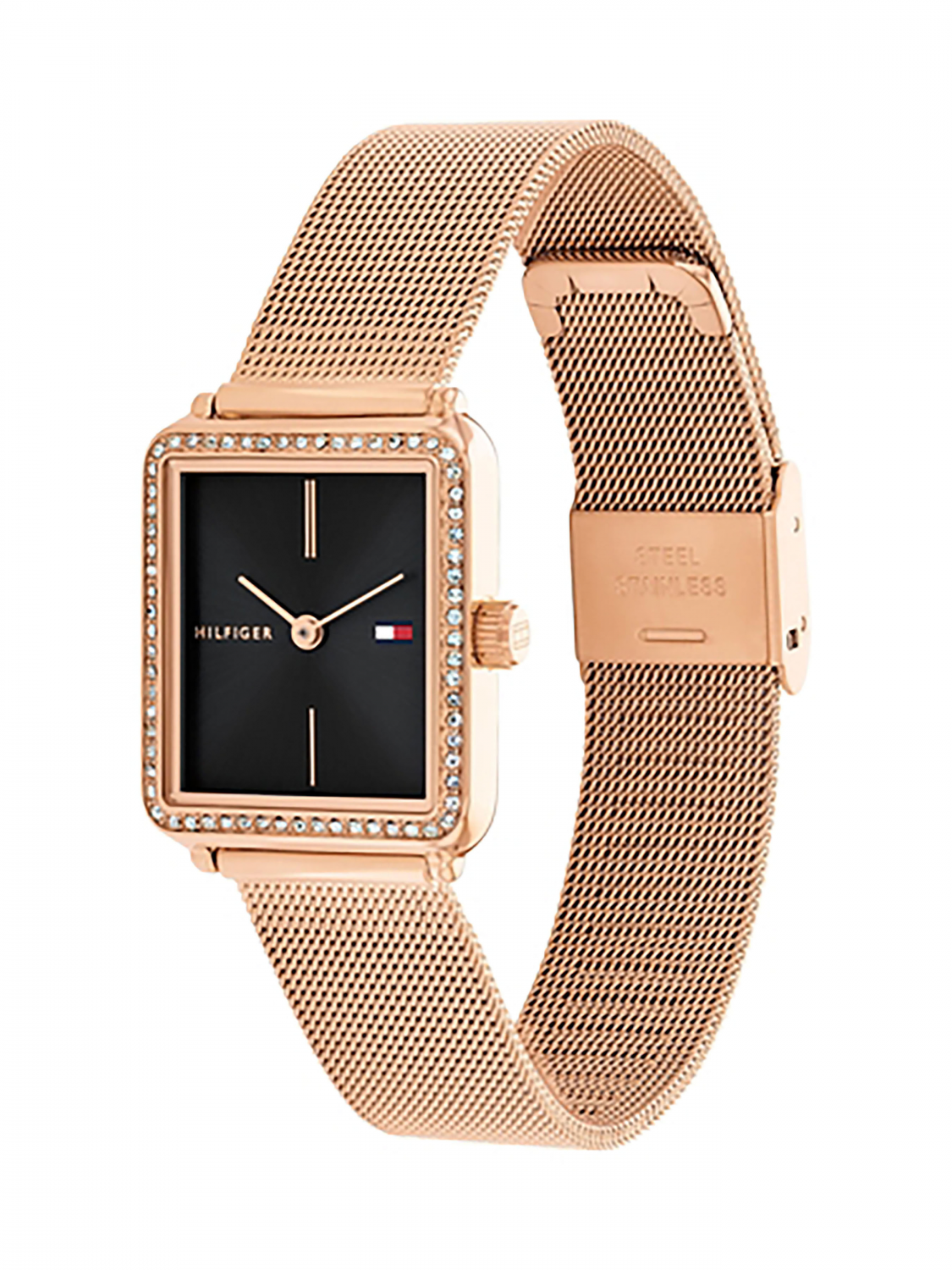 Женские кварцевые часы с прямоугольным корпусом 24мм из нержавеющей стали. Минеральное стекло. Стальной браслет миланского плетения. Рифленая заводная головка.