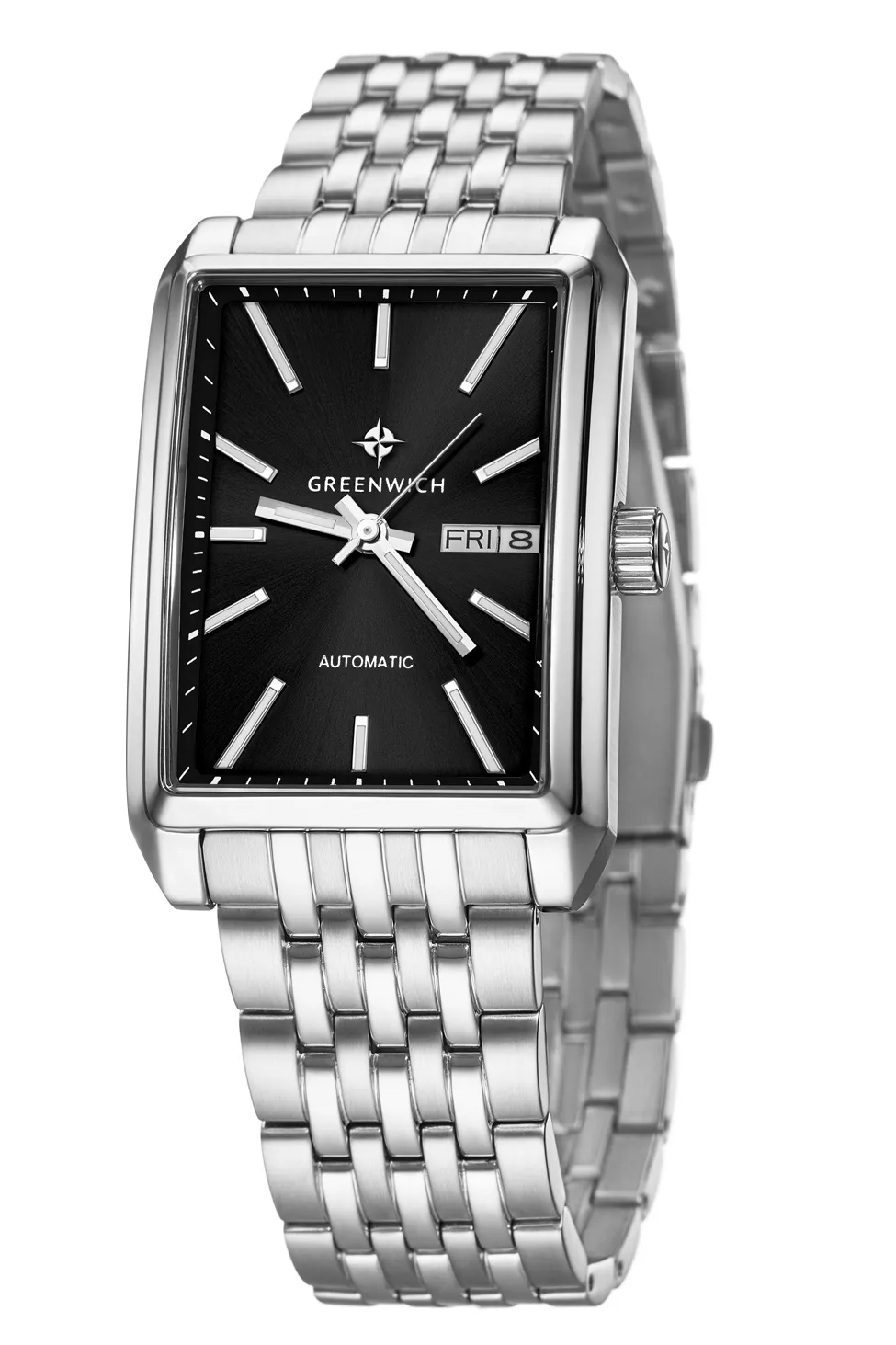 Новое прочтение классических часов от Greenwich: часы в прямоугольном корпусе со скошенными углами серии Caravel. В качестве основного материала была выбрана гипоаллергенная нержавеющая сталь, из нее сделаны корпус и браслет модели. За движение стрелок, дисков даты и дня недели на черном циферблате отвечает механизм с функцией автоподзавода. За его работой можно наблюдать через прозрачное окошко на задней крышке часов. Стрелки и риски светятся в темноте — они покрыты люминесцентным составом. На браслете установлена застежка-клипса, надежная и удобная в использовании. Механические часы Caravel подходят для ежедневного использования, тем более, что в таком режиме ротор будет заводить пружину механизма от обычных движений руки, без необходимости завода с помощью заводной головки.