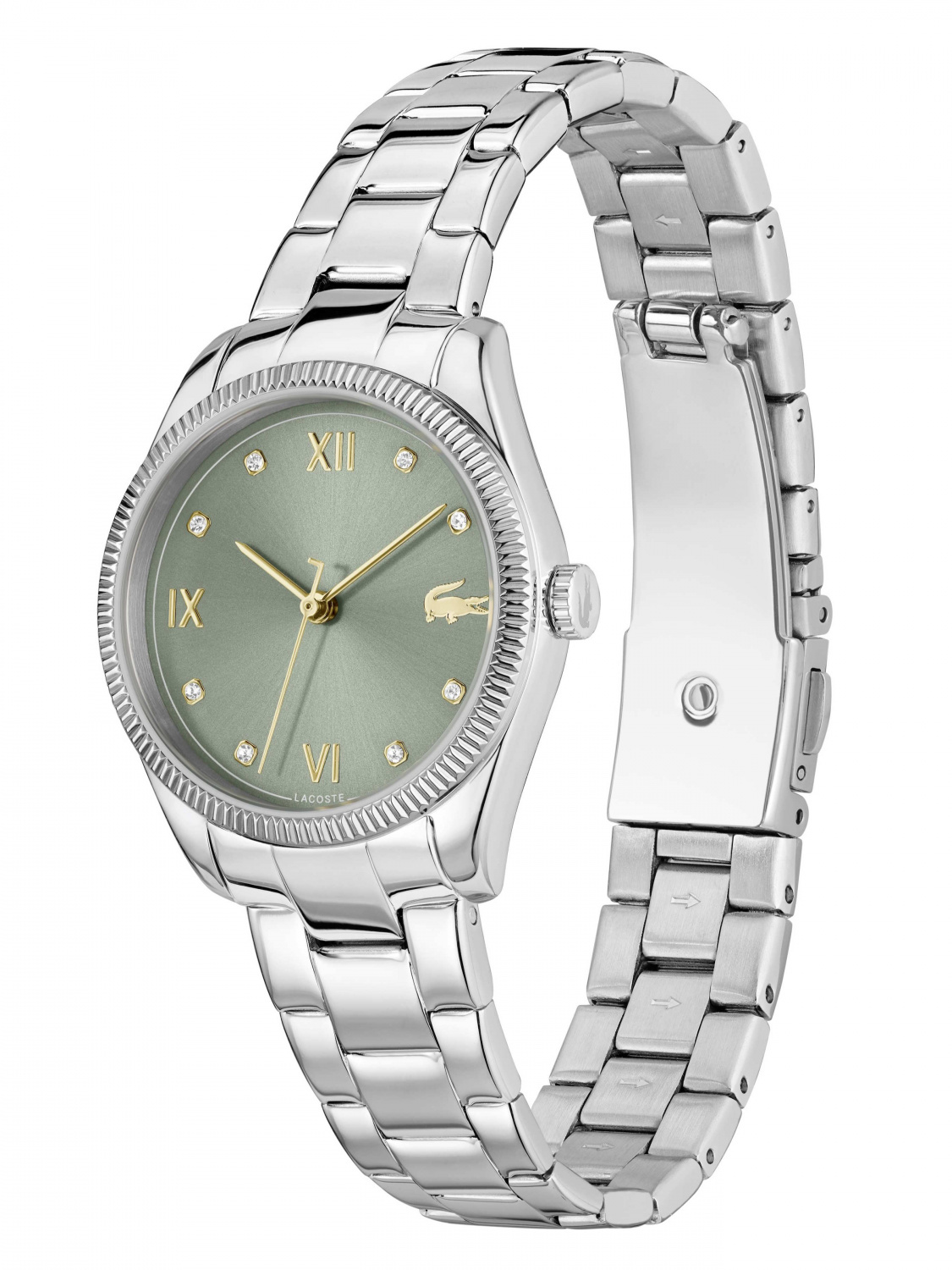 Зеленый циферблат с кристаллами защищен минеральным стеклом, устойчивым к мелким повреждениям и царапинам.