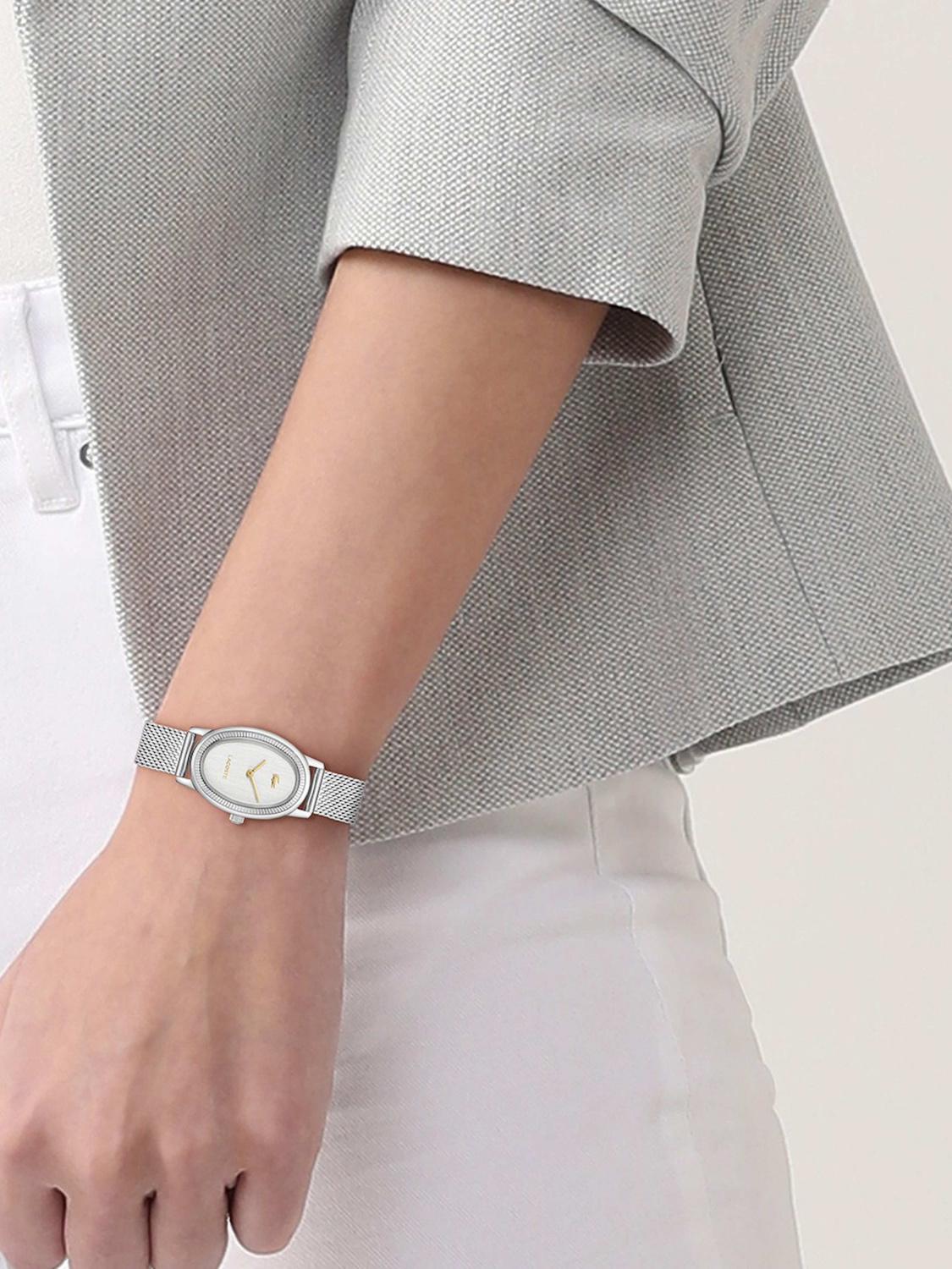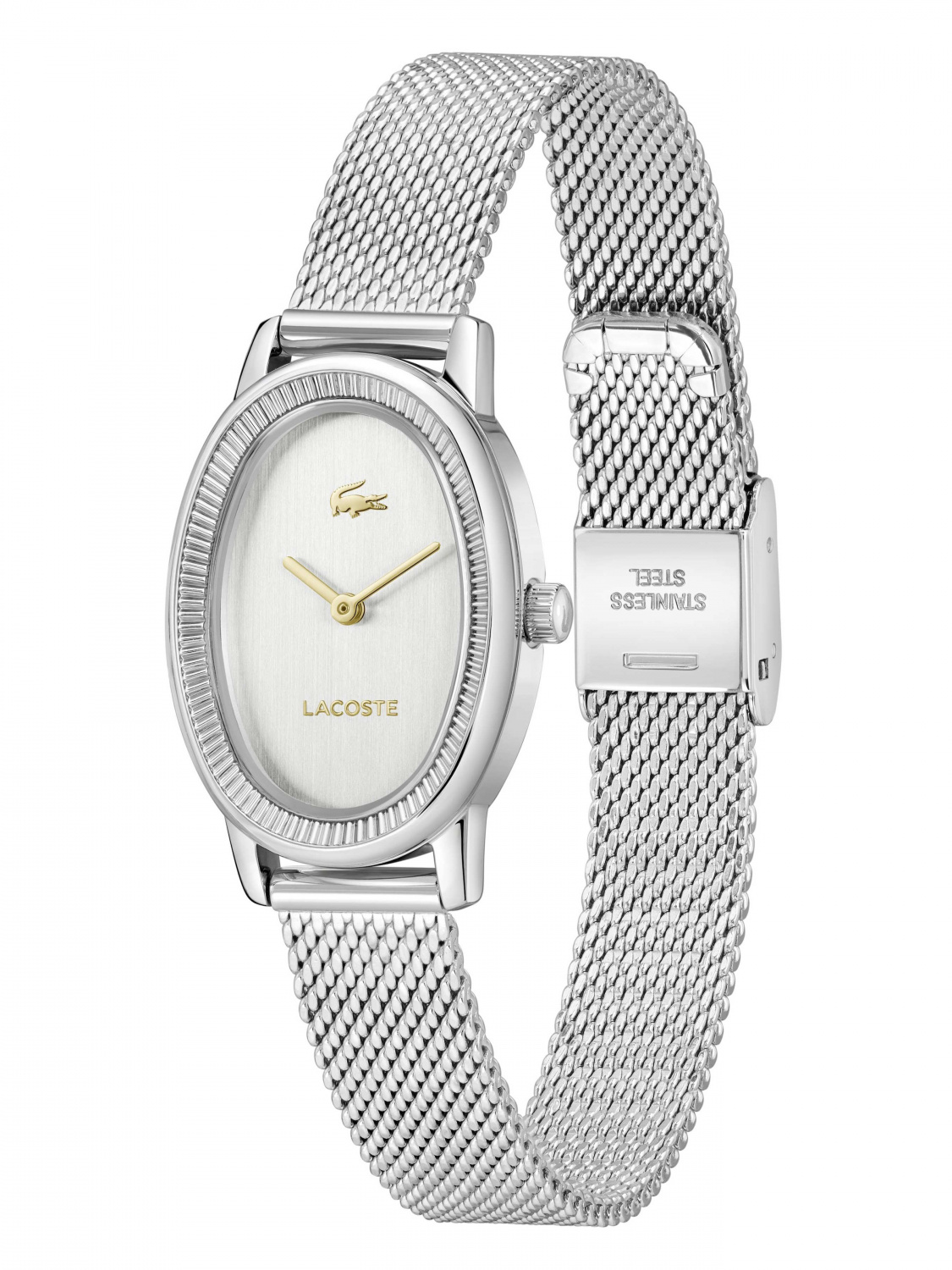 Овальный корпус и браслет миланского плетения выполнены из нержавеющей стали 316L.