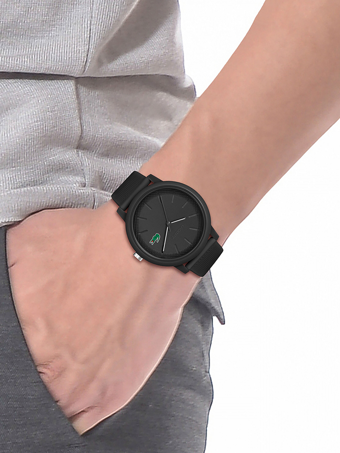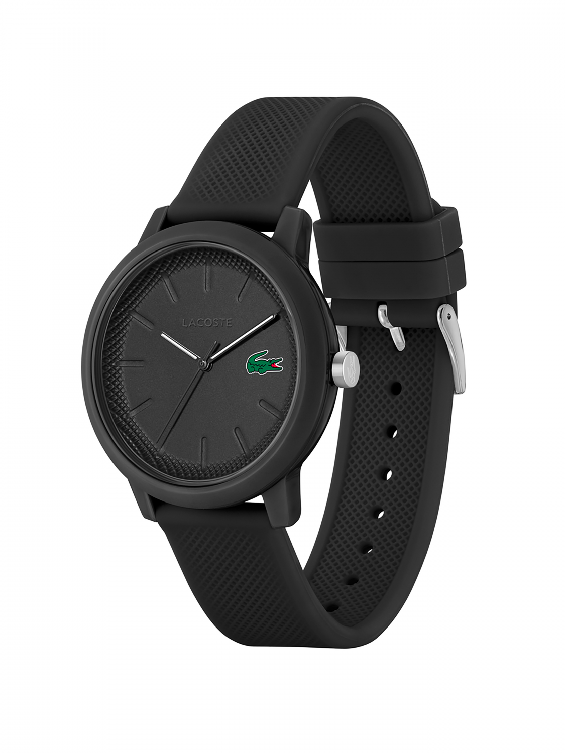 Часы Lacoste.12.12 оснащены силиконовым ремешком с культовой текстурой ХЛÓПКА ПИКЕ, а на кончике ремешка имеется тисненный крокодил.