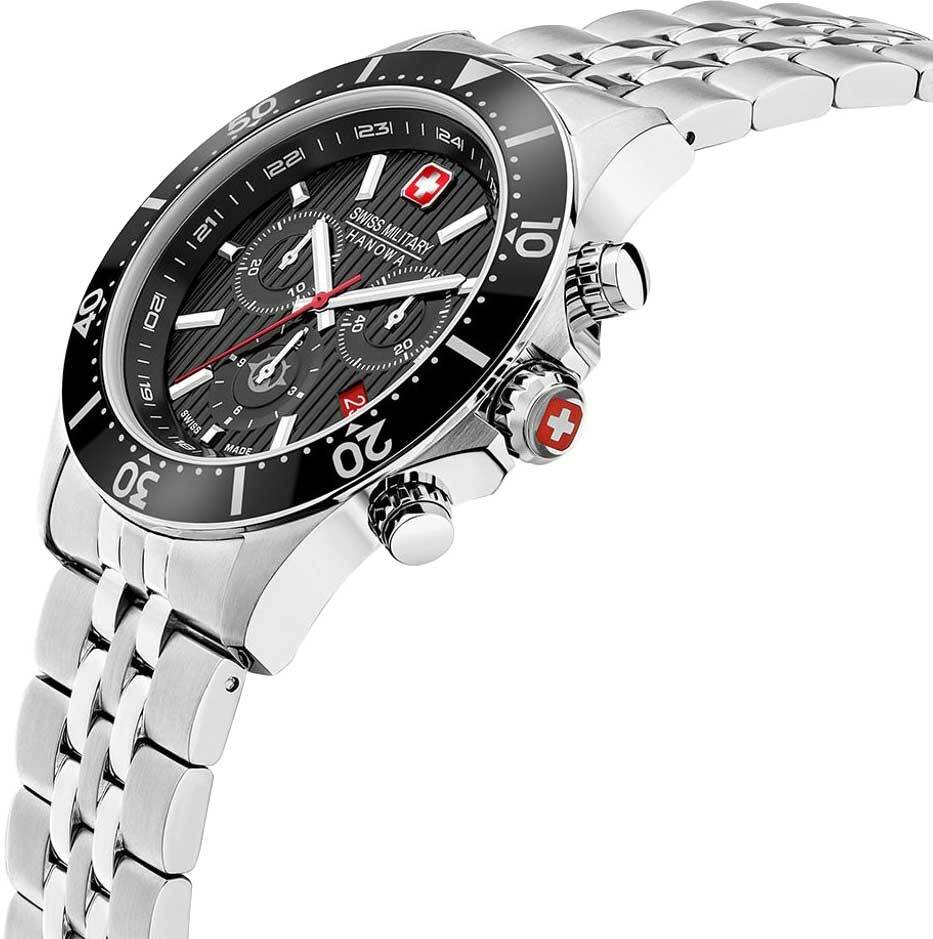 Швейцарские мужские часы-хронограф с секундомером. Коллекция Flagship X Chrono.Круглый корпус из нержавеющей стали. Циферблат с метками в виде штрихов украшен рельефным декоративным узором в виде вертикальных линий. Сапфировое стекло защищает циферблат от механического воздействия (царапин). Стальной браслет с раскладывающейся застежкой. Застежка с системой блокировки. Водозащита 10 АТМ/bar.