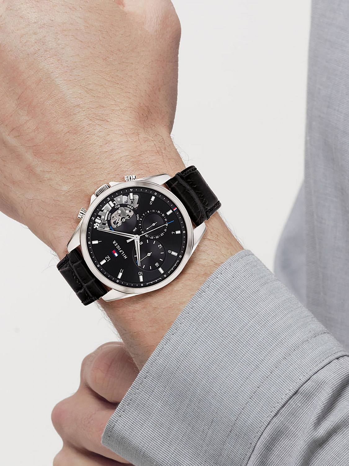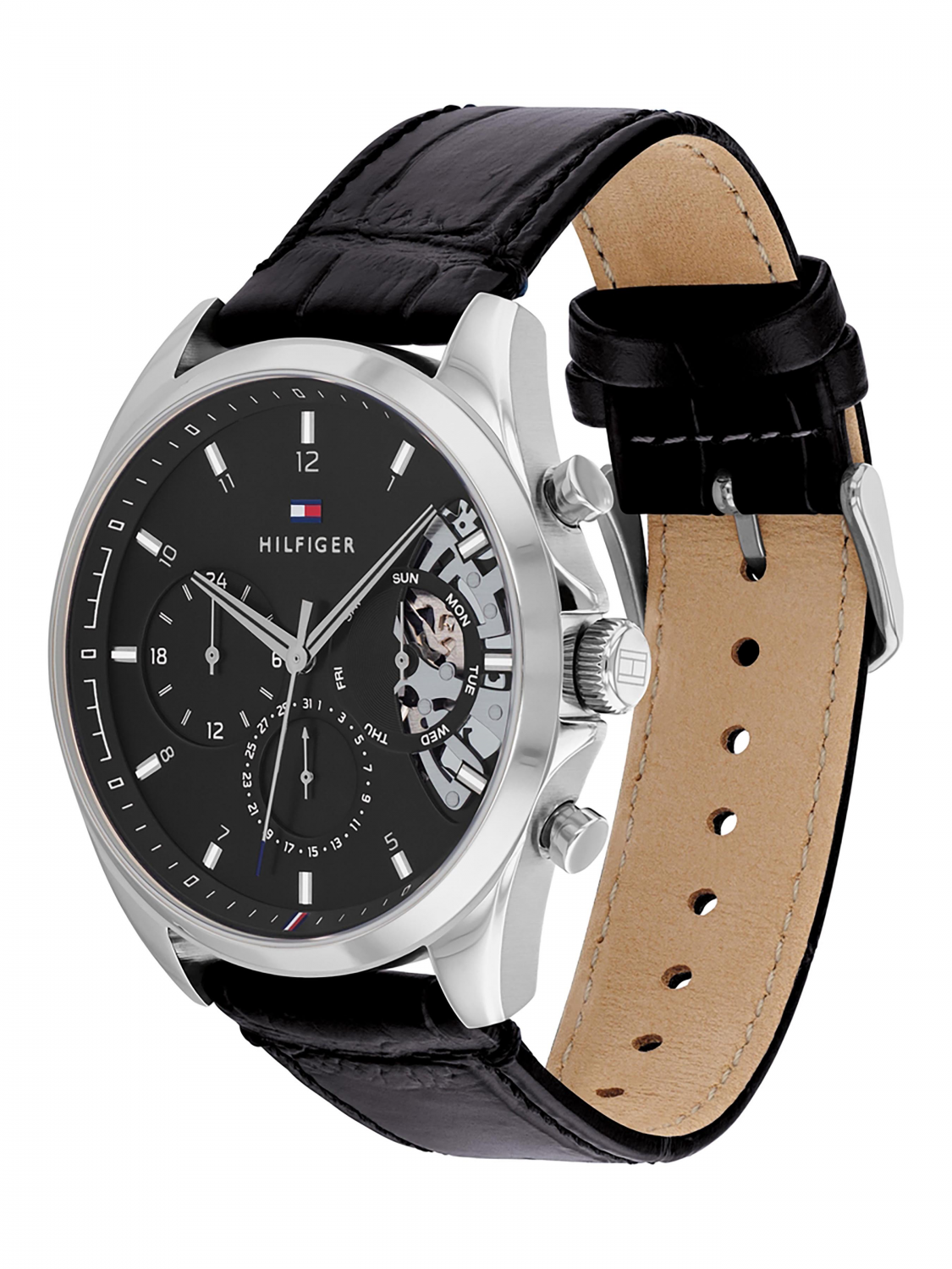 Мужские кварцевые часы с круглым стальным корпусом. Коллекция Baker.12-ти и 24-х часовой формат времени. Дата и день недели вынесены на отдельные циферблаты. Минеральное стекло. Кожанный ремешок на традиционной застежке.Водозащита 5 АТМ/bar.