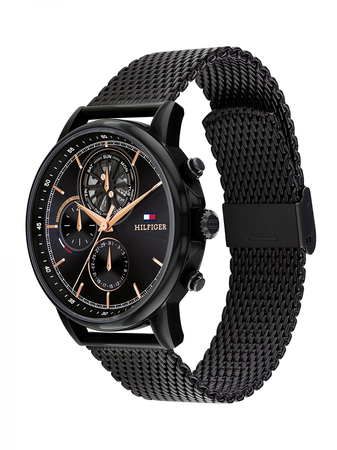 Мужские часы коллекции Stewart. Круглый стальной корпус.12-ти и 24-х часовой формат времени. Дата и день недели вынесены на отдельные циферблаты. Минеральное стекло. Корпус часов и браслет выполнены из стали с PVD-покрытием черного цвета. Браслет с раскладывающейся застежкой. Водозащита 3 АТМ/bar.