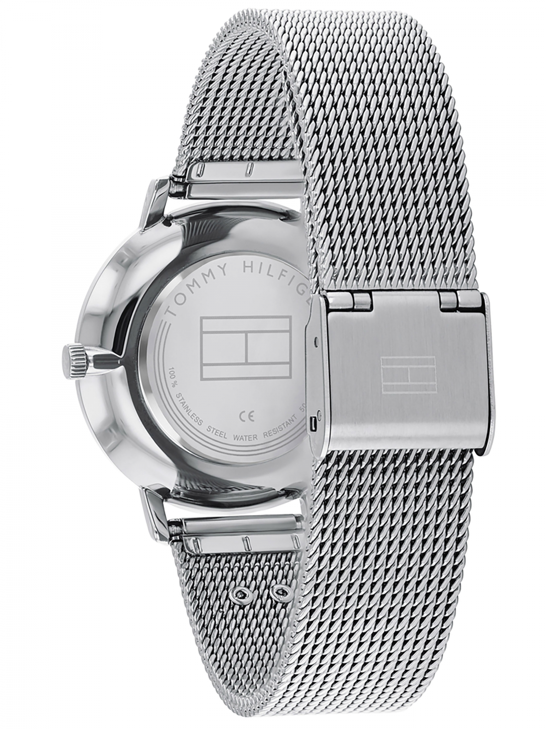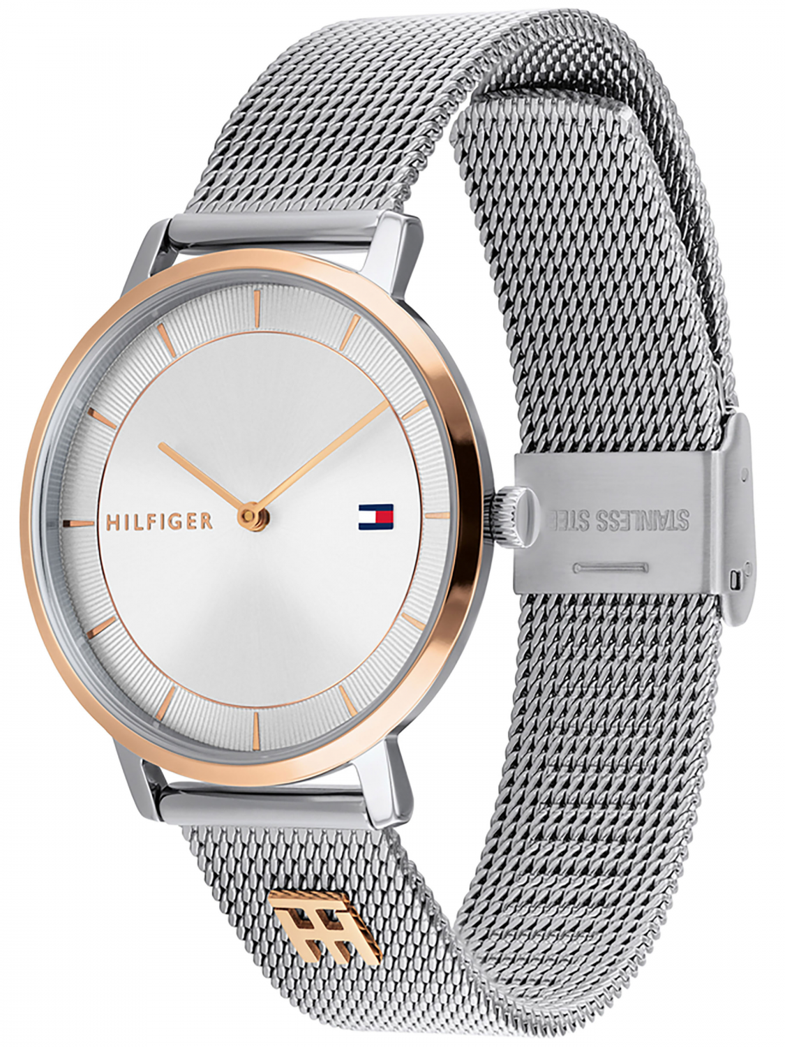 Женские кварцевые часы на стальном браслете миланского плетения. Часы с круглым корпусом. Минеральное стекло. Циферблат с метками в виде штрихов. Рифленая заводная головка.