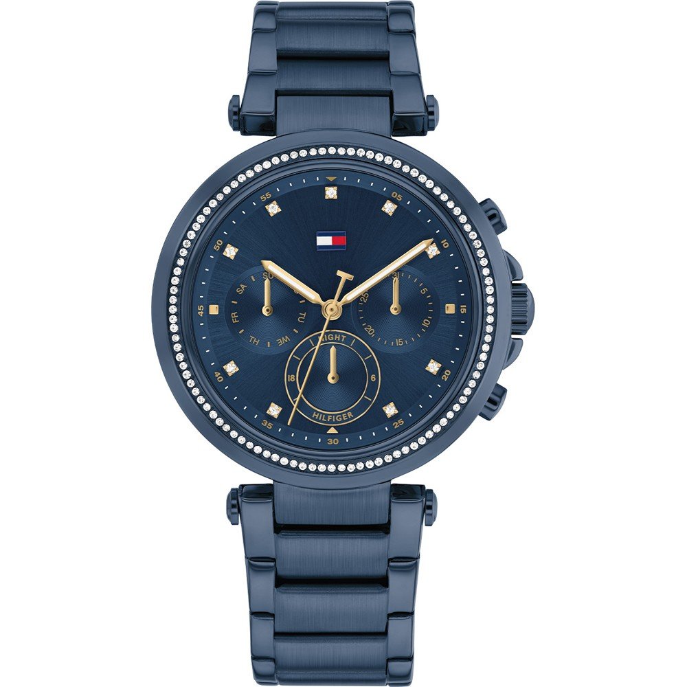 Женские кварцевые часы Tommy Hilfiger Emily. Круглый стальной корпус с синим ПВД покрытием. Безель декорирован кристаллами. Циферблат защищен минеральным стеклом. Метки в виде точек, инкрустированных кристаллами. Указатели даты и дня недели вынесены на отдельные циферблаты. 12-ти и 24-х часовой формат времени. Стальной браслет с синим ПВД покрытием и раскладывающейся застежкой.