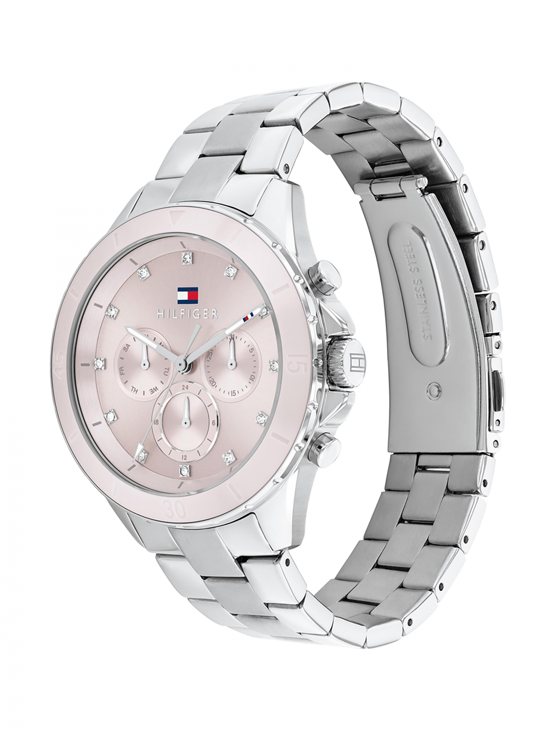 Женские кварцевые часы коллекции Mellie.Круглый стальной корпус.12 и 24 часовой формат времени.Дата и день недели вынесены на отдельные циферблаты.Метки ввиде кристаллов.Минеральное стекло. Стальной браслет с раскладывающейся застежкой. Водозащита 5 АТМ/bar.