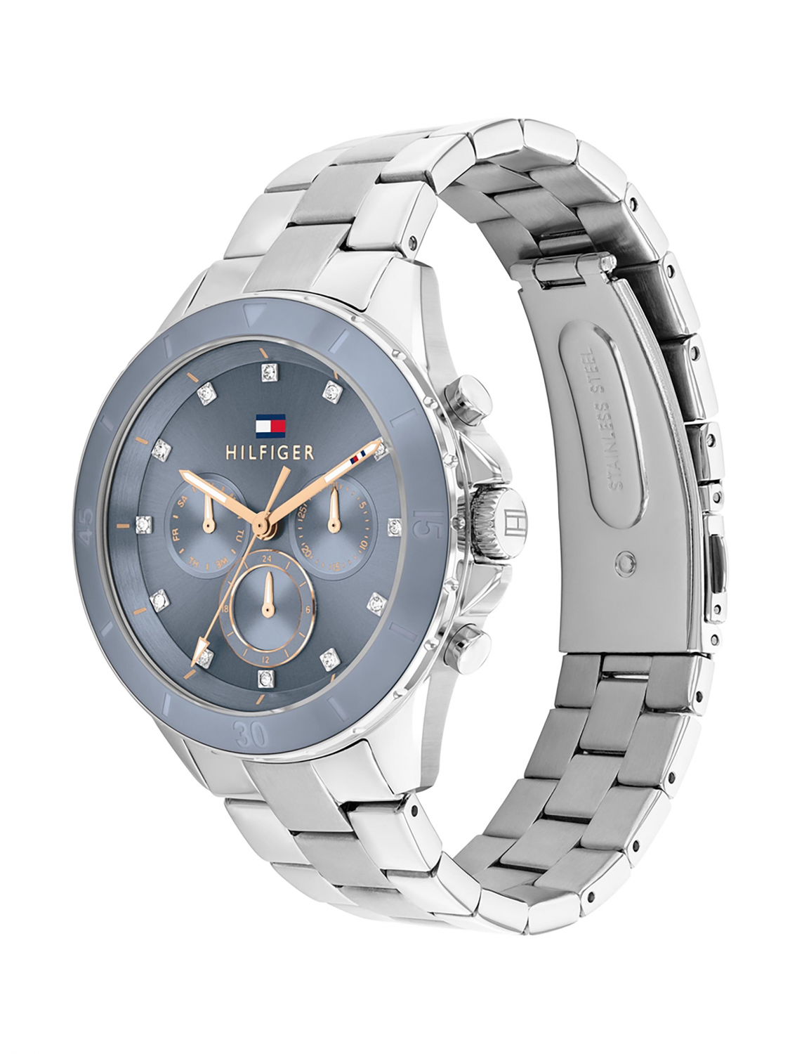 Женские кварцевые часы из коллекции Mellie.Круглый стальной корпус.12-ти и 24-х часовой формат времени. Дата и день недели вынесены на отдельные циферблаты. Циферблат с метками в виде точек - кристаллов. Минеральное стекло.Корпус и браслет выполнены из стали. Стальной браслет с раскладывающейся застежкой. Водозащита 5 bar.