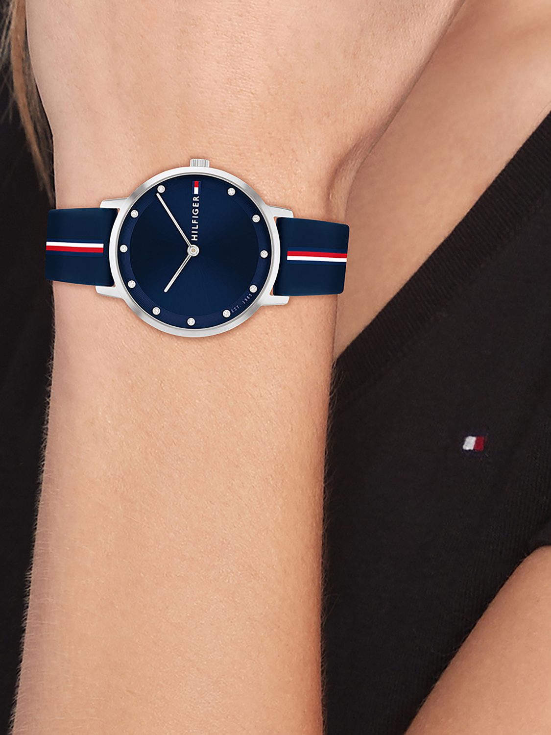 Часы наручные женские кварцевые Tommy Hilfiger. Стальной корпус с синим циферблатом. Минеральное стекло. Спортивный,силиконовый ремешок,выполнен в цветовом решении этого бренда.Ремешок на традиционной застежке.Водозащита 5ATM.