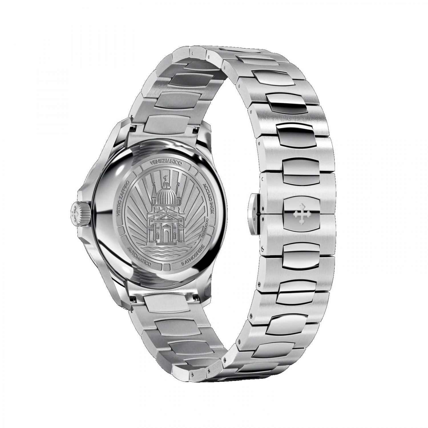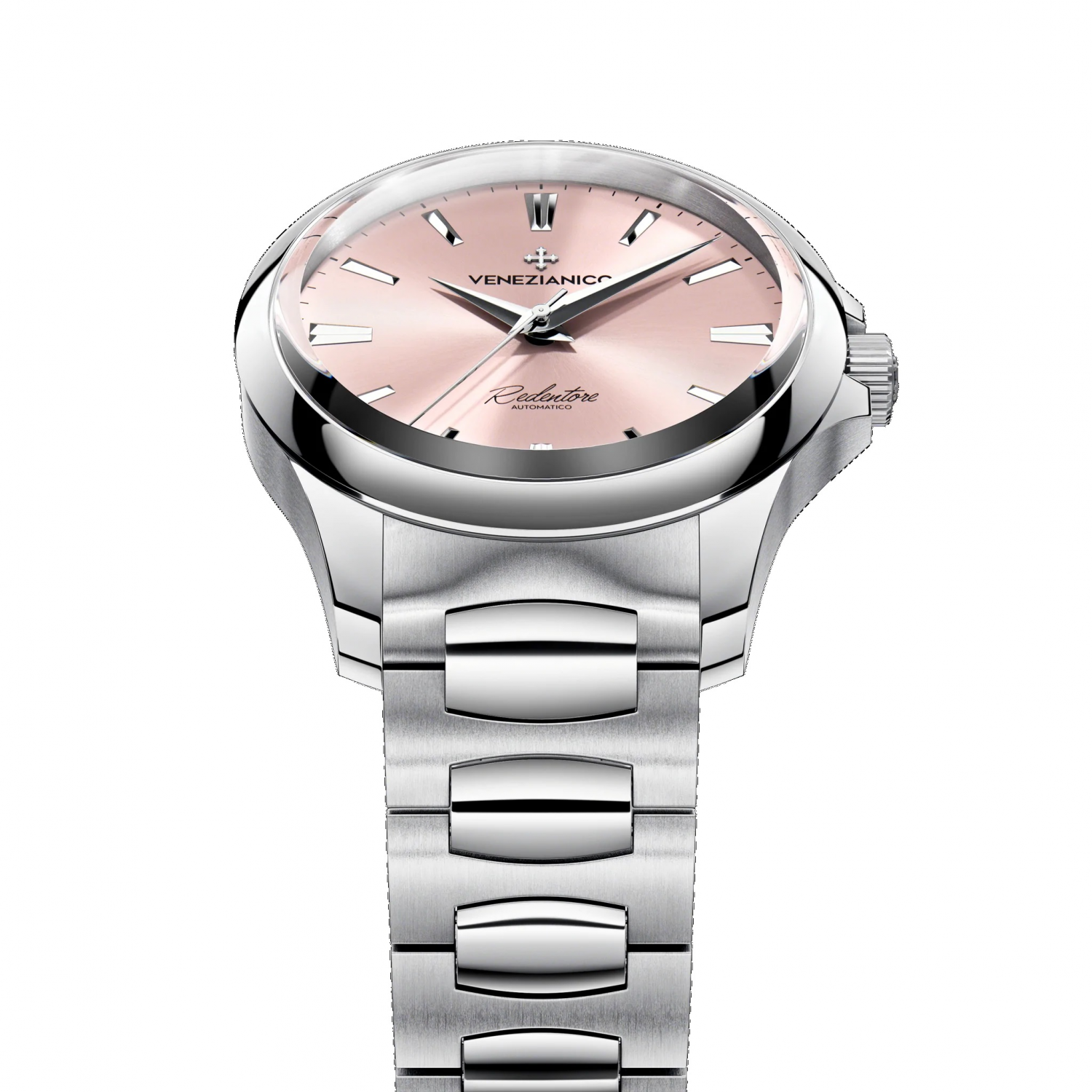 Привлекательные женские часы станут отличным дополнением любого вашего образа. Redentore 36. Часы с круглым корпусом. Дизайн вдохновлен храмом Basilica del Redentore, который находится на самом широком острове Венеции. Архитектор храма Андреа Палладио, который известен как отец неоклассического стиля. В механизме 24 камня, 21600 полуколебаний в час. Запас хода 41 час. Возможность ручного завода. Циферблат с метками в виде штрихов выполнен по технологии Sunray (солнечные лучи). Задняя крышка крепится на 6-ти винтах и украшена выгравированным изображением храма Basilica del Redentore. Рифленая заводная головка с защитой. Браслет Canova с раскладывающейся застежкой. Для изготовления данного браслета требуется 16 различных форм.