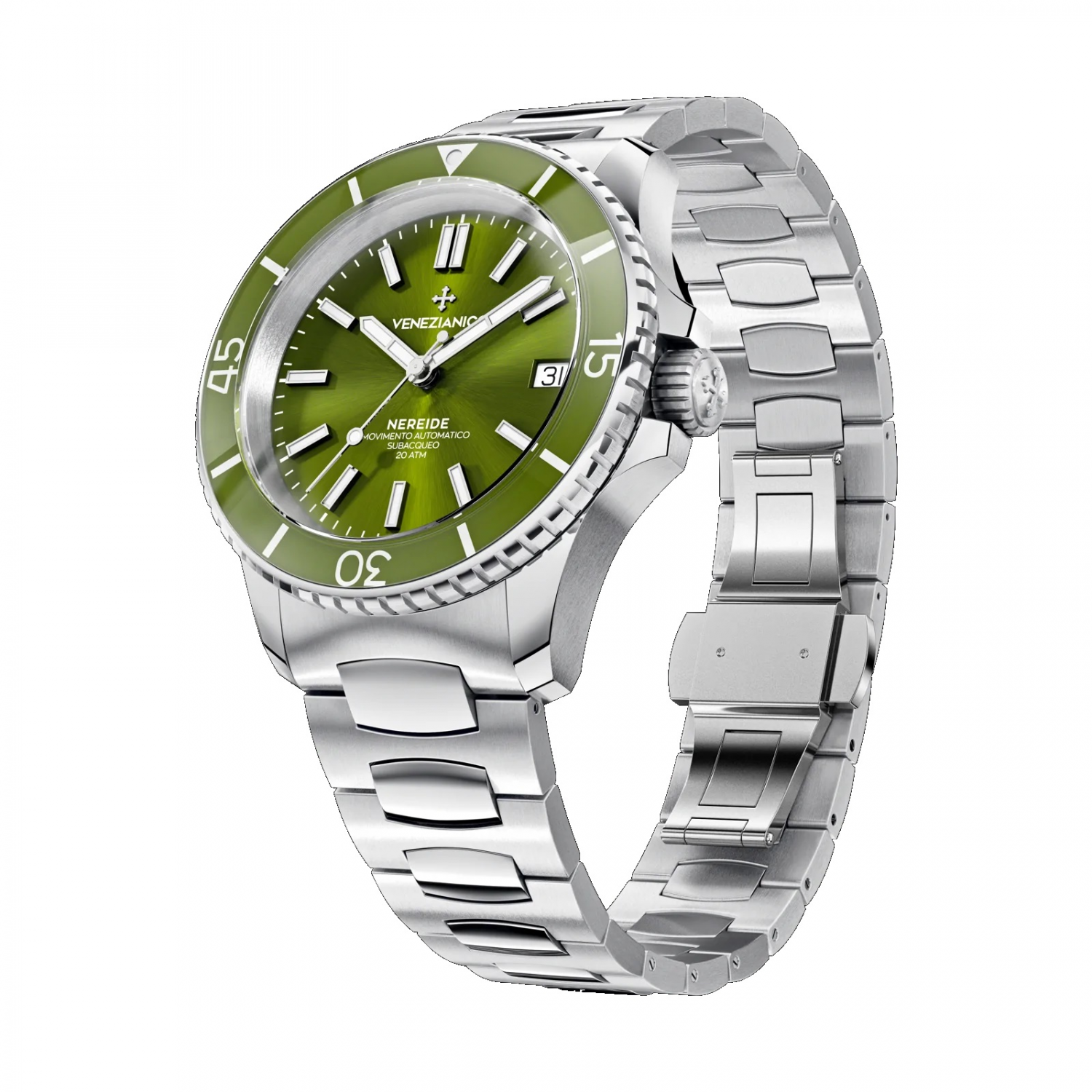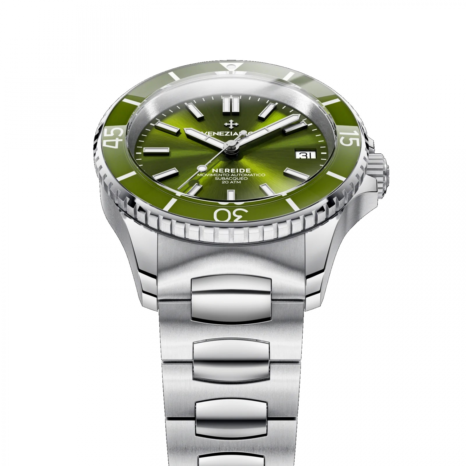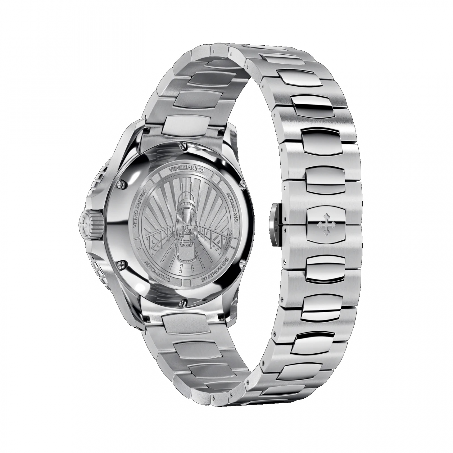 Удобный мужской аксессуар с надежным автоматическим механизмом не позволит упустить ни одной важной минуты вашего времени. Nereide 39. Мужские часы. Вдохновением на создание коллекции послужила подводная лодка итальянского королевского флота Nereide, которая была построена в 1913 году на военно-морской верфи Венеции. В механизме 24 камня, частота 21600 полуколебаний в час. Запас хода 41 час. Возможность ручного завода. Циферблат с метками в виде штрихов выполнен по технологии Sunray (солнечные лучи). Окошко даты находится в положении 3 часа. Безель со стеклянной вставкой BK7 вращается на 120 щелчков в одном направлении. Задняя крышка крепится на 6-ти винтах и украшена выгравированным изображением подводной лодки Nereide. Индивидуальный серийный номер. Завинчивающаяся заводная головка с защитой. Браслет Canova с раскладывающейся застежкой. Для изготовления данного браслета требуется 16 различных форм.